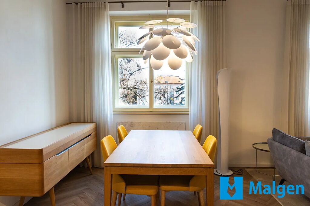 Interiér prošel kompletní rekonstrukcí s důrazem na detail, kvalitní materiály a promyšlený design. Dominantou bytu je prostorný obývací pokoj s kuchyní na míru, vybavenou vestavěnými spotřebiči a elegantními povrchy z přírodního kamene. Z ložnice je přímý vstup do šatny, která poskytuje dostatek úložného prostoru. V koupelně se snoubí mramor, nechybí vana, sprchový kout ani sauna. Pračka se sušičkou je šikovně ukrytá technické místnosti, stejně jako další praktické úložné prvky v celém bytě. Podlahy tvoří dřevěné parkety a nábytek je vyrobený na míru, což podtrhuje harmonický charakter interiéru.