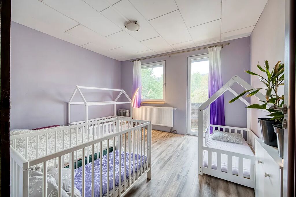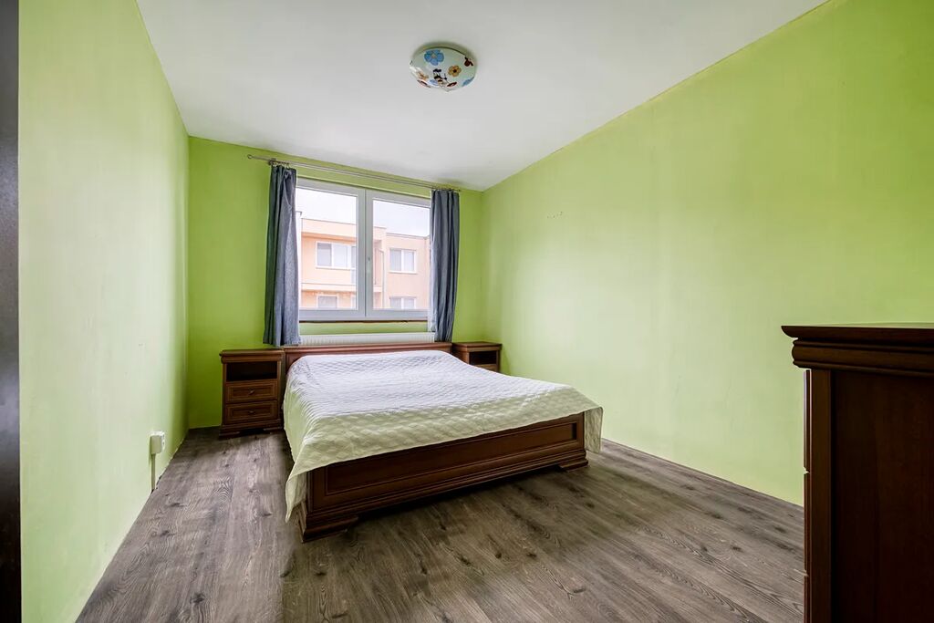 V patře jsou čtyři ložnice, koupelna a oddělené WC. Dva pokoje mají přístup na lodžii (5 m²).