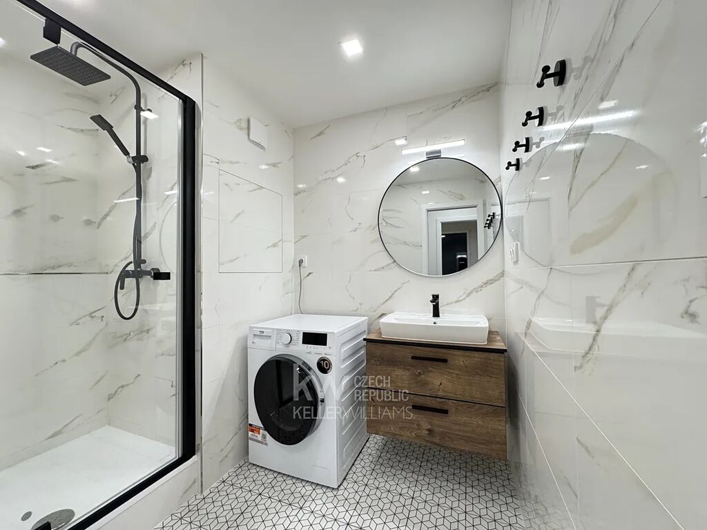 nová koupelna, sanitární zařízení a moderní povrchy s novou pračkou Beko