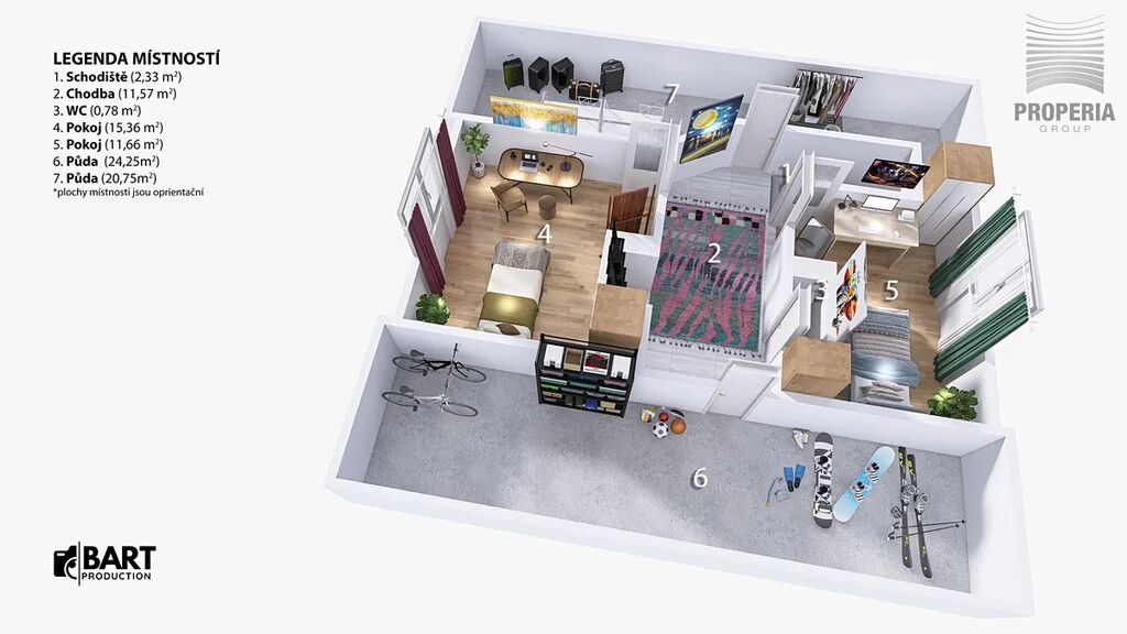 Půdní prostor nabízí možnost vybudování obytného podkroví a rozšíření obytné plochy.