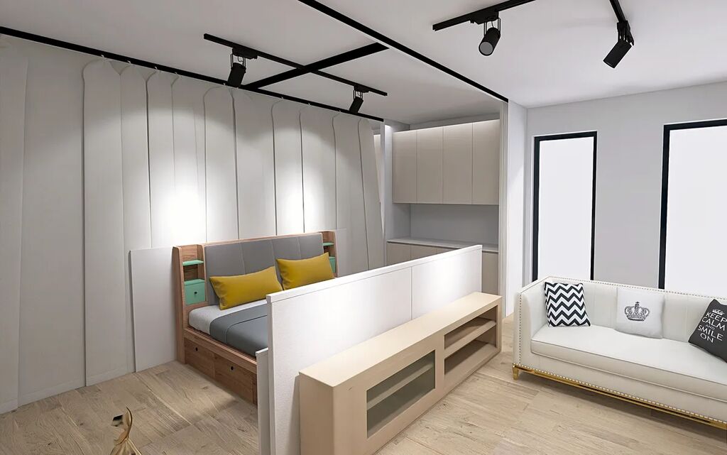 Hlavní obytná část je navržena jako jeden otevřený celek, který je chytře zónován pomocí nábytkové příčky a závěsů. Díky tomu nabízí jasně oddělenou obývací část, spací zónu a kuchyň s jídelním stolem, aniž by prostor působil přeplněně či uzavřeně. Velkoformátová okna zajišťují dostatek denního světla a opticky prostor zvětšují.