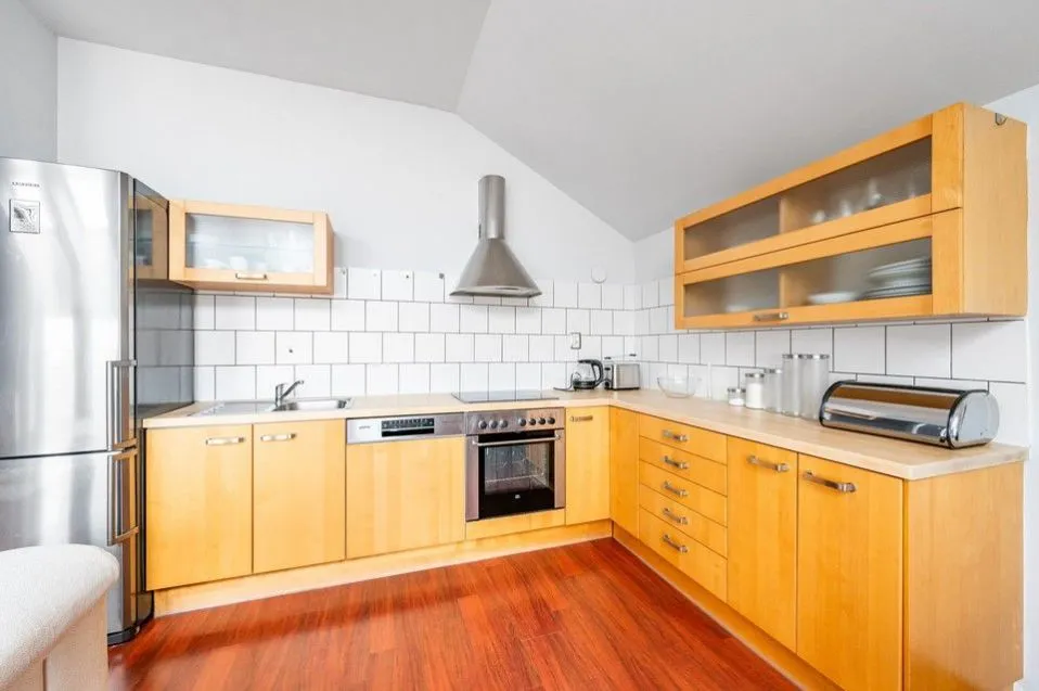 Zajímavě řešený interiér s přídavnými střešními okny a kamenným obložením stěn dodávají bytu na zajímavosti a vzdušnosti. Daleké výhledy na panorama Prahy umocňují velmi příjemnou atmosféru bytu. Byt je plně vybavený nábytkem, viz. foto. V obývacím pokoji je sedací souprava, konferenční stolek a smart TV, dále kuchyňský kout s jídelním stolem a židlemi. Kuchyňská linka disponuje všemi spotřebiči - nová myčka, sklokeramická deska, trouba, digestoř, lednice. V designové ložnici je manželská postel, komoda a úložné prostory v podobě vestavěných skříní na míru. Koupelna má vanu, umyvadlo a pračku, toaleta je umístěna zvlášť.