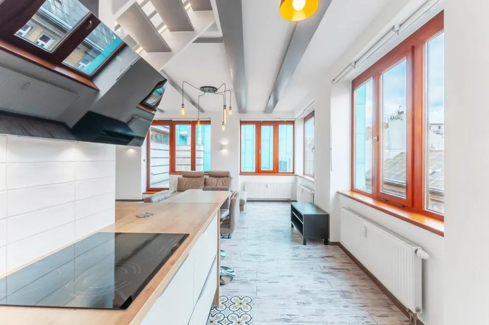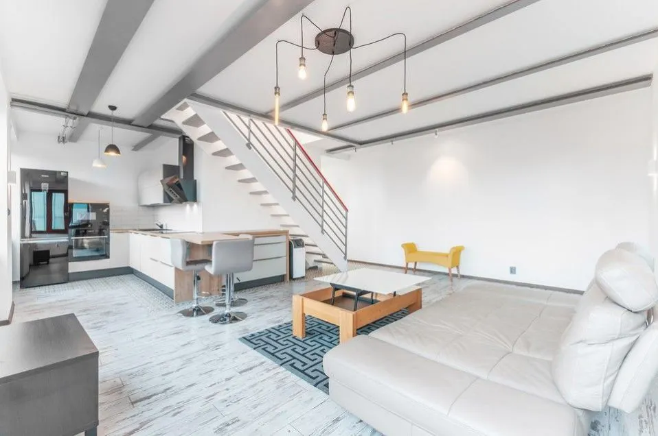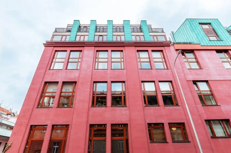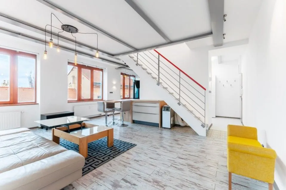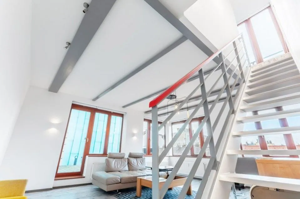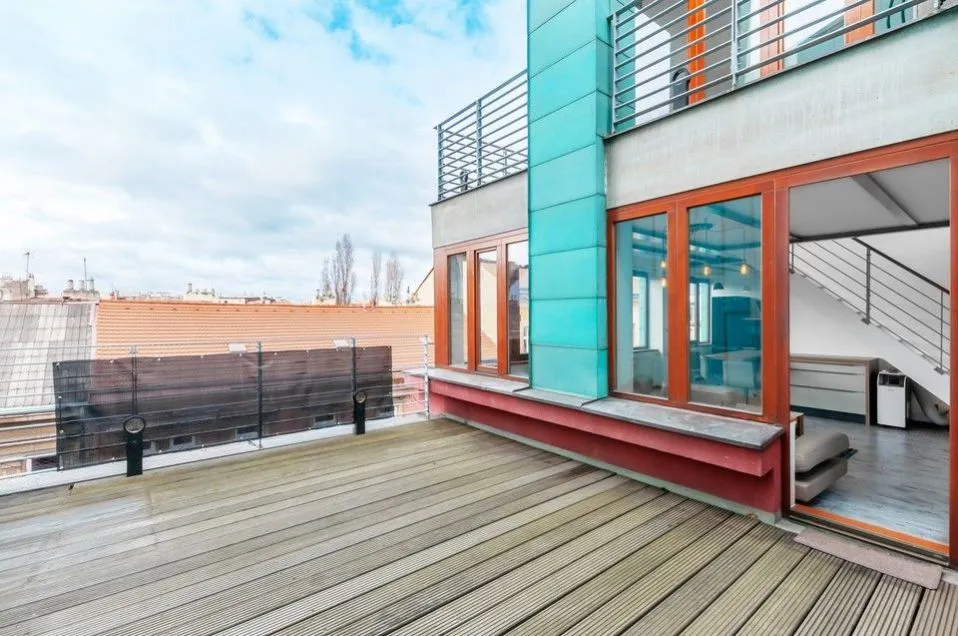 Nadstandardní světlý loftový byt 3+kk, 129 m2, se dvěma terasami, infrasaunou, klimatizací, garážovým stáním a sklepem (v ceně), v horních patrech (4. a 5.) budovy s výtahem v developerském projektu Lofty Palmovka, Praha 8 - Libeň (ocenění prestižní soutěže Best of Reality).