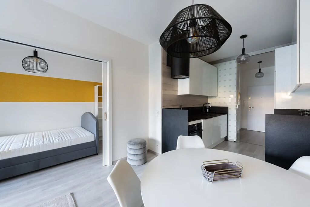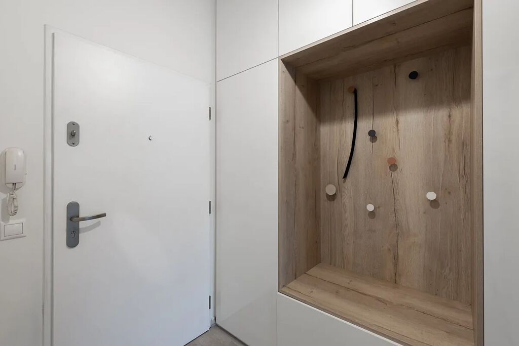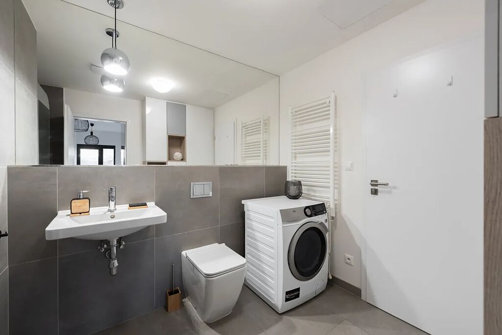 Interiér bytu je řešen tak, aby poskytoval maximální komfort pro každodenní život. Velký obývací pokoj je propojen s kuchyní, která je kompletně vybavena moderními spotřebiči – nechybí sklokeramická varná deska, trouba s funkcí mikrovlnky, digestoř, myčka ani lednice s mrazákem. Kuchyň nabízí také dostatek pracovní plochy i úložného prostoru. Ložnice je zařízena velkou postelí s matrací a nadstandardně prostornými vestavěnými skříněmi. Koupelna je velmi prostorná, vybavená velkou vanou, toaletou, praktickými skříňkami a pračkou se sušičkou. V bytě jsou i bezpečnostní fólie na oknech, což zvyšuje pocit soukromí a bezpečí. Součástí vybavení je vše, co vidíte na fotografiích.