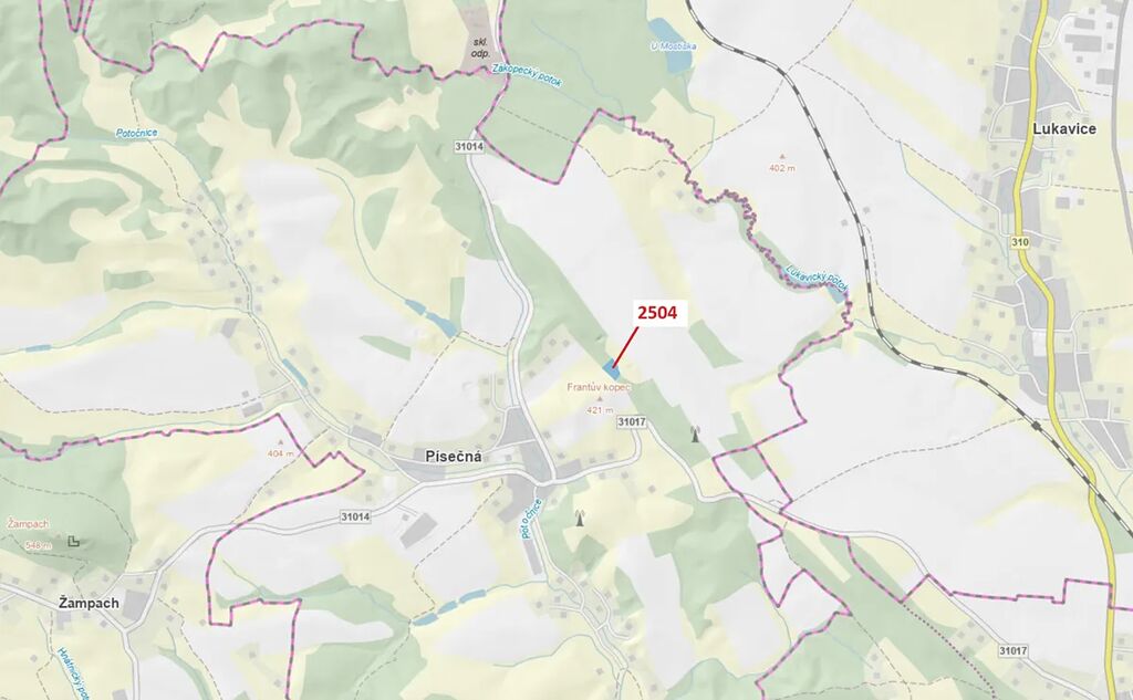 Lesní pozemek o výměře 3497 m2, parcelní číslo 2504, podíl 1/1, katastrální území Písečná u Žamberka, obec Písečná, obec s rozšířenou působností Žamberk, okres Ústí nad Orlicí, Pardubický kraj.