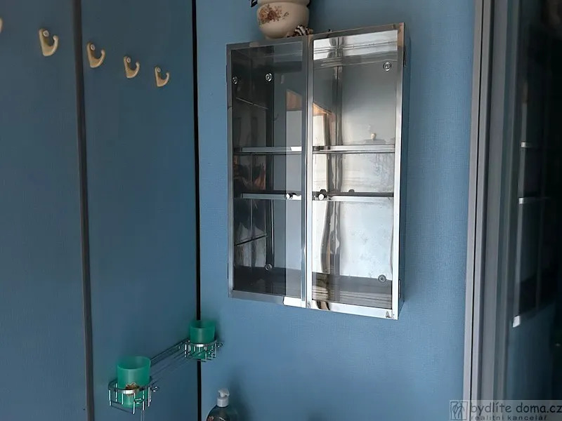 V koupelně cca 5 m2 je sprchový kout a keramické umyvadlo se skříňkou, zrcadlem a policemi. Topné nástěnné spirálové těleso. Dlažba. Kombinované WC. Vše v tzv. umakartovém jádře.