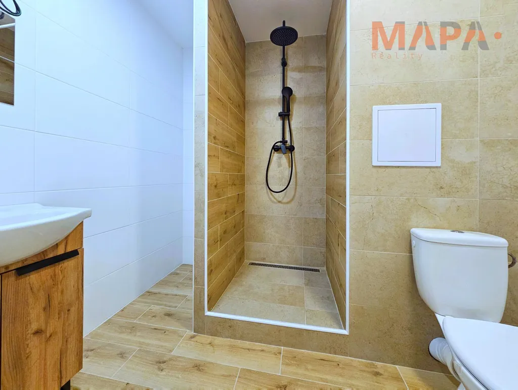 Součástí tohoto hezkého bytu po rekonstrukci je zděná koupelna se sprchovým koutem, WC a kuchyňská linka.
