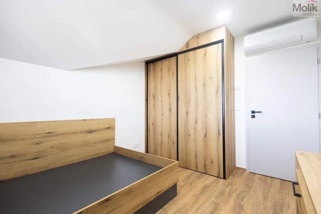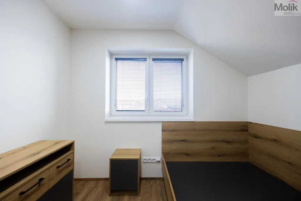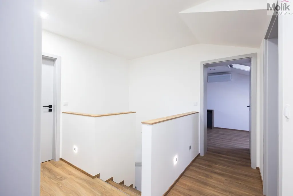 V patře se nachází 4 zařízené pokoje včetně nábytku, skříní a postelí s matracemi, to vše vyrobeno na zakázku, každý pokoj má klimatizaci, koupelna s WC, vanou, sprchový koutem a umyvadlem, technická místnost.