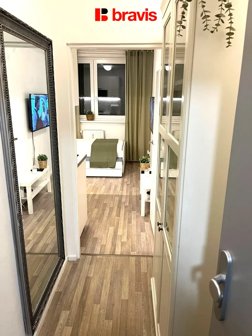 Byt se nachází v suterénu a je částečně zařízen (kuchyňská linka na míru, sporák se sklokeramickou deskou, digestoř). Obývací část se nabízí bez vybavení.