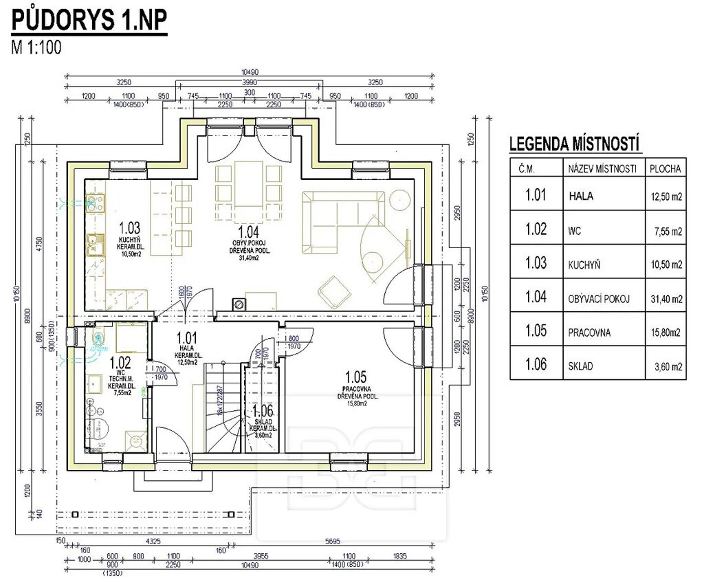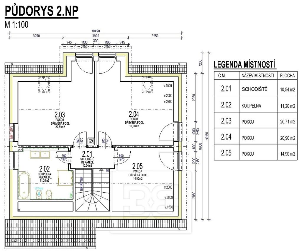 Po vchodu do domu je po levé straně koupelna se sprchovým koutem, která bude efektně oddělena skleněnou stěnou, za kterou je plynový kotel se zásobníkem na vodu, jež zajišťuje vytápění (prostřednictvím podlahového topení) / teplou vodu. Zde je též dostatek prostoru na sušičku/pračku. Dále je zde obrovský obývací pokoj, kde je příprava na krb. Tato část může být příčkou rozdělena na dvě místnosti, která může být přístupná i zvenku a může být tak užívána samostatně, např. jako pracovna, či koncipovat dům dvougeneračně. Dále je v přízemí další ložnice. Schodištěm, pod kterým je praktický sklad, se dostaneme do druhého podlaží, kde jsou 3 prostorné ložnice a obrovská koupelna se sprchovým koutem, vanou, dvěma umyvadly, wc s bidetem. Praktičnost podtrhuje prostorná (25m2) zateplená půda, která je přístupná z centrální chodby.