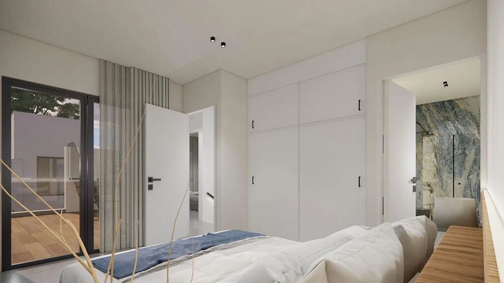 V horním patře jsou dvě prostorné ložnice, každá s vlastní koupelnou, z nichž jedna je en suite. Oba pokoje mají vstup na soukromou otevřenou terasu o rozloze 17 m². Pro ty, kteří chtějí ještě více venkovního prostoru, je možné za příplatek vybudovat střešní solárium.