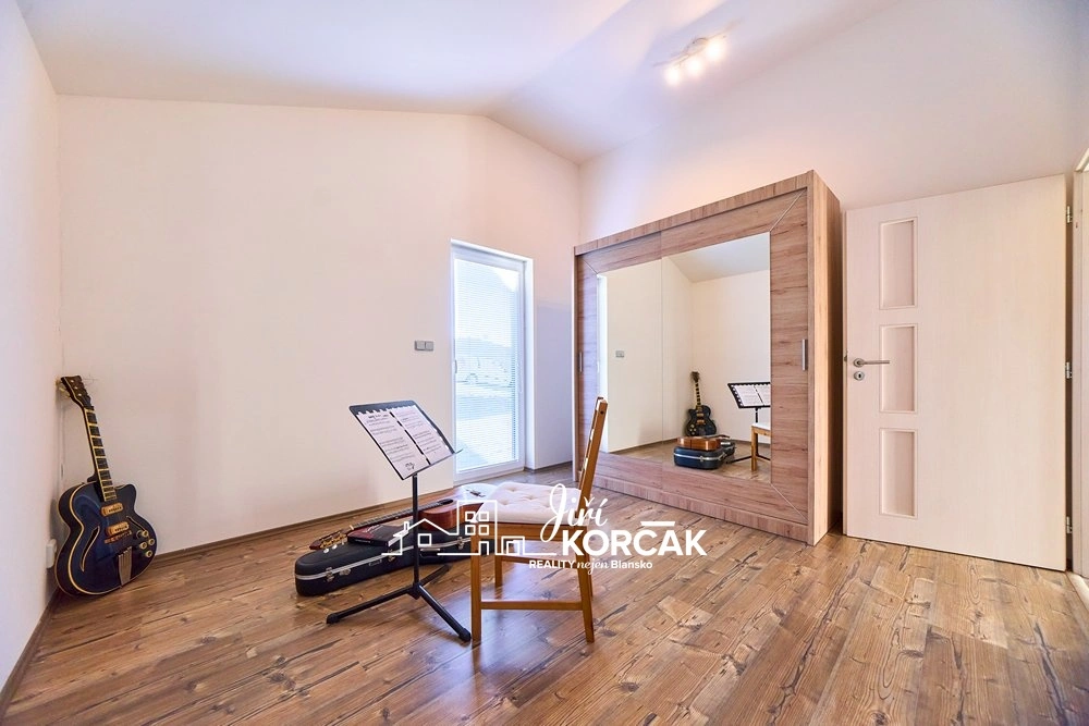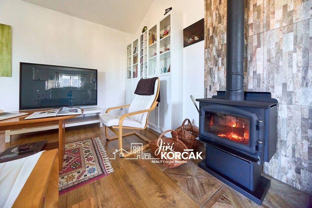 Uvnitř najdete prostorný obývací pokoj volně navazující na kuchyni, ložnici, dětský pokoj i velmi hezký pokoj