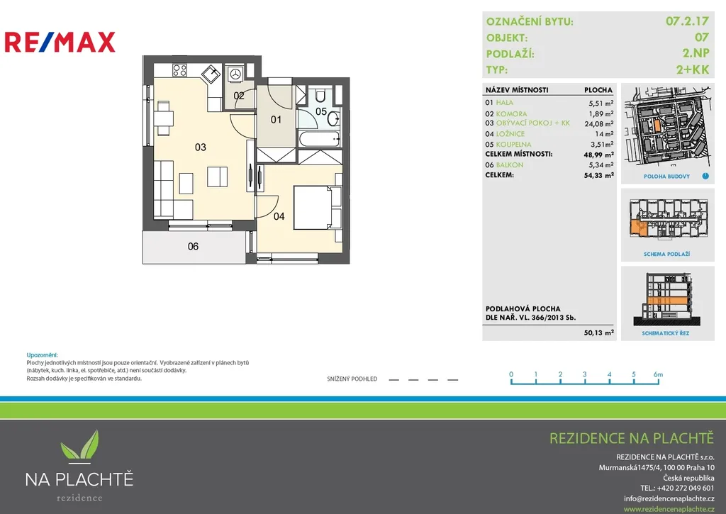 Byt je situován do 2. NP cihlové budovy, a jeho celková podlahová plocha činí 54,33 m2.