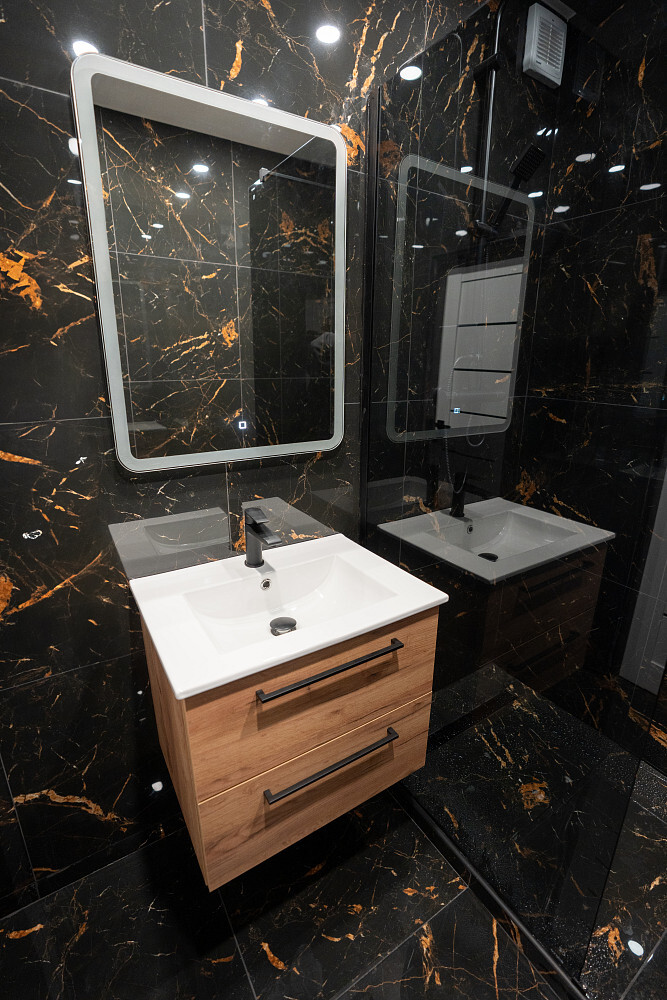 Koupelna a samostatné WC jsou laděny do elegantního stylu s výraznými obklady v černém mramorovém designu. V koupelně se nachází prostorný walk-in sprchový kout bez vaničky, designové zrcadlo s dotykovým ovládáním a černé baterie, které esteticky navazují na styl celého bytu.