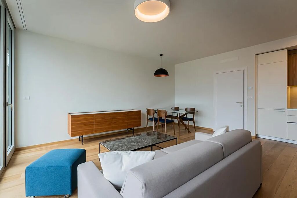 Moderní, plně zařízený byt 2+kk (1 ložnice, 1 koupelna), s terasou (11,48m2) a celkovou plochou 89,58m2, je situován ve 3. NP zcela nového luxusního rezidenčního komplexu s výtahem, recepcí, bazénem, saunou, prostornou zahradou ve dvoře, sklepem a možností parkování v podzemním parkovišti.