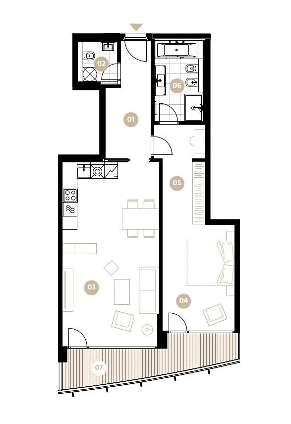 Interiér tohoto bytu je plně zařízený a dispozičně nabízí vstupní chodbu (9 m2) s oddělenou toaletou, prostorný obývací pokoj (34,5m2) s plně vybaveným kuchyňským koutem (lednice, mrazák, trouba, myčka, elektrická varná deska, mikrovlnná trouba, digestoř), samostatnou ložnici (14,9m2) se šatnou (8,83m2) a stylovou koupelnu (7,58m2), jež disponuje vanou, sprchovým koutem, umyvadlem, toaletou a bidetem. Výhodou bytu je dostupnost terasy z obou místností. Součástí vybavení bytu je pračka, sušička a TV. K dispozici je sklep.