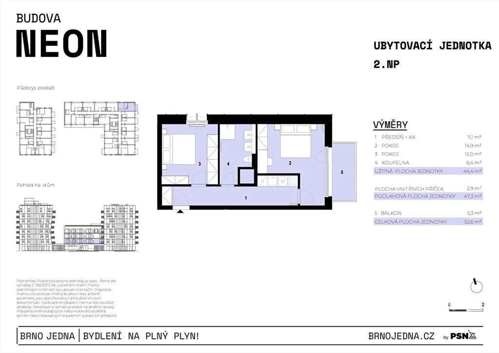 Dispozice 2+1 a celková plocha 47,3 m² ve 2. podlaží poskytují promyšleně řešený prostor, který je ideální jak pro investiční účely, tak pro budoucí vlastní bydlení. Jednotka nabízí dva neprůchozí pokoje, kuchyň, elegantní koupelnu se sprchovým koutem a WC a navíc na východ orientovaný balkon, díky čemuž je byt krásně prosvětlený po celý den.