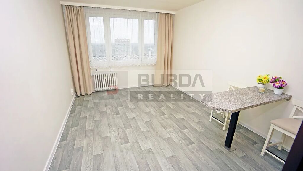 V bytě je kuchyňská linka v odstínu dub sonoma, s nerezovým dřezem a keramickým obkladem. Před kuchyňskou linkou je konzumní pult se dvěma židlemi. V pokoji je nové stropní svítidlo s dálkovým ovladačem.