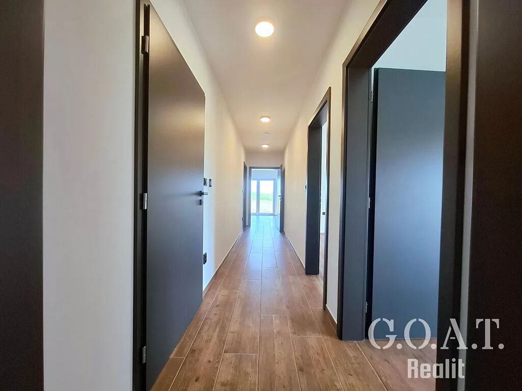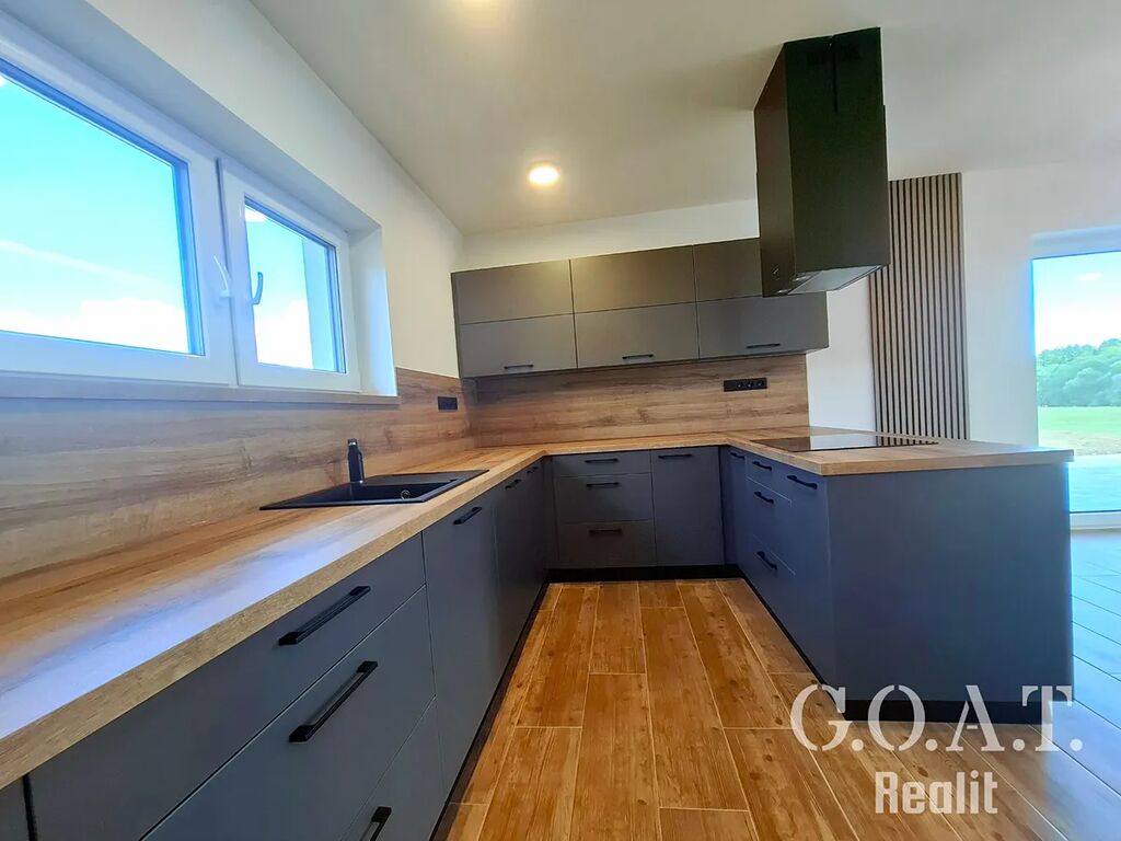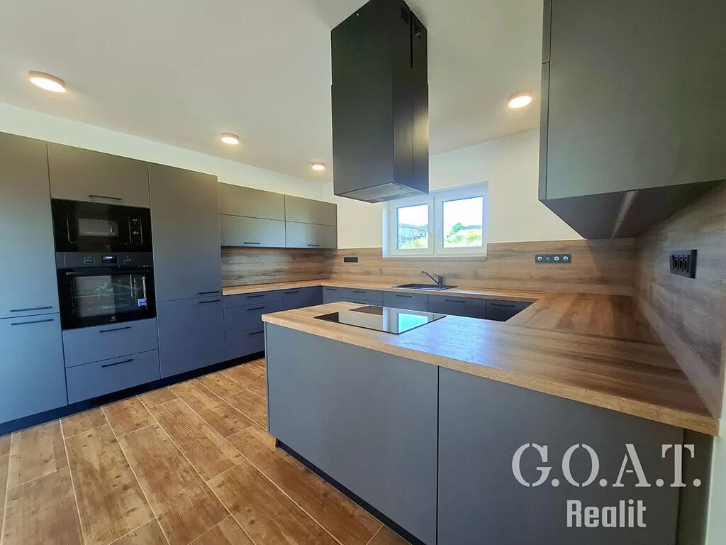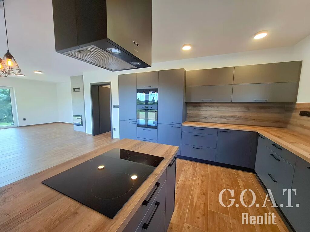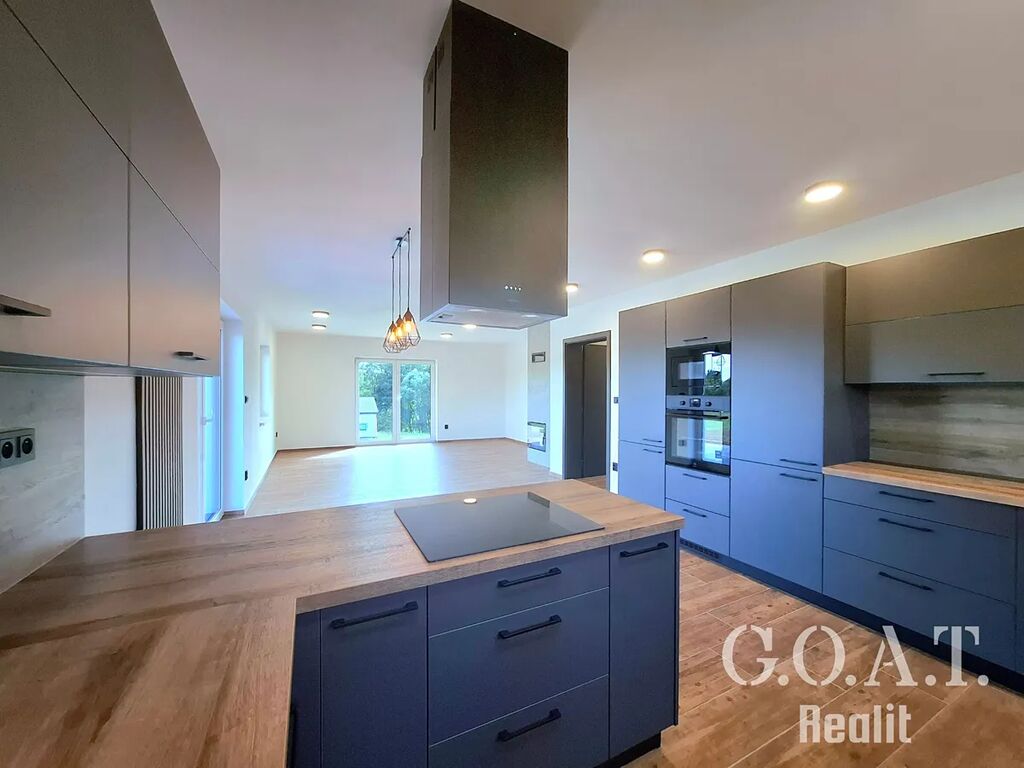 Srdcem domu je velkorysý obývací pokoj s kuchyňským koutem (47 m²) s luxusní kuchyňskou linkou a kompletní sadou vestavěných spotřebičů. Přímý vstup na terasu s pergolou láká k relaxaci i letnímu posezení s výhledem.