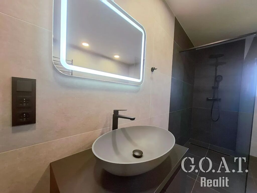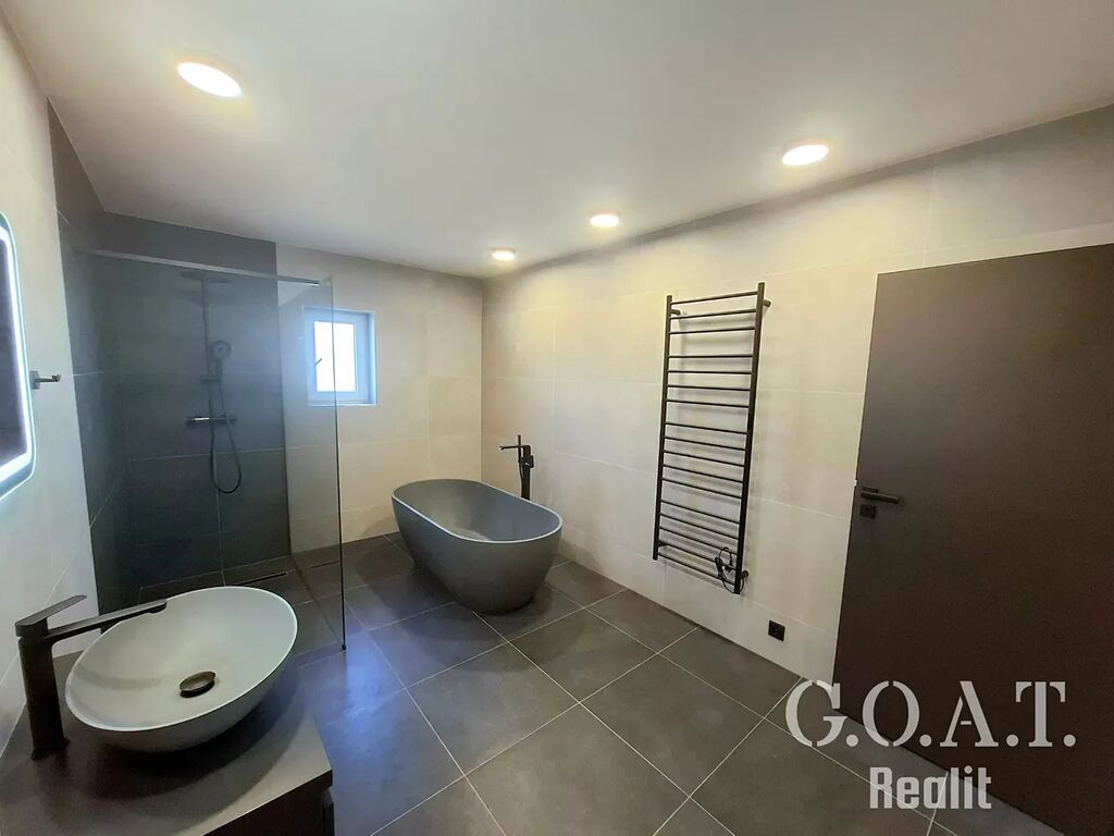 Koupelna nabízí sprchový kout i volně stojící vanu. Dispozice dále zahrnuje ložnici (18 m²), dva prostorné pokoje (25 m² a 22 m²), technickou místnost, chodbu a zádveří.