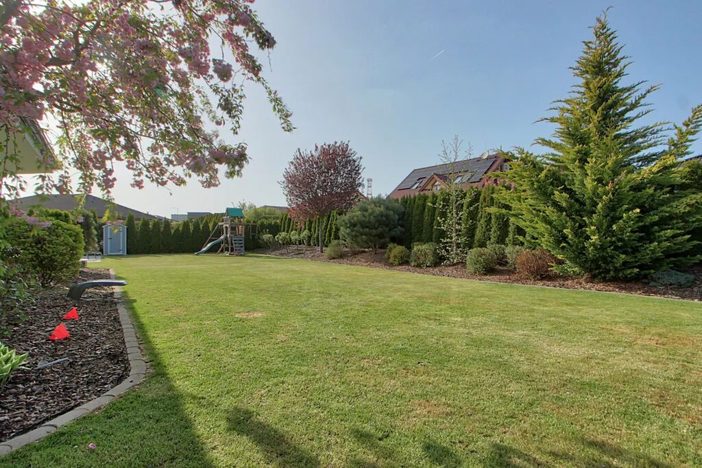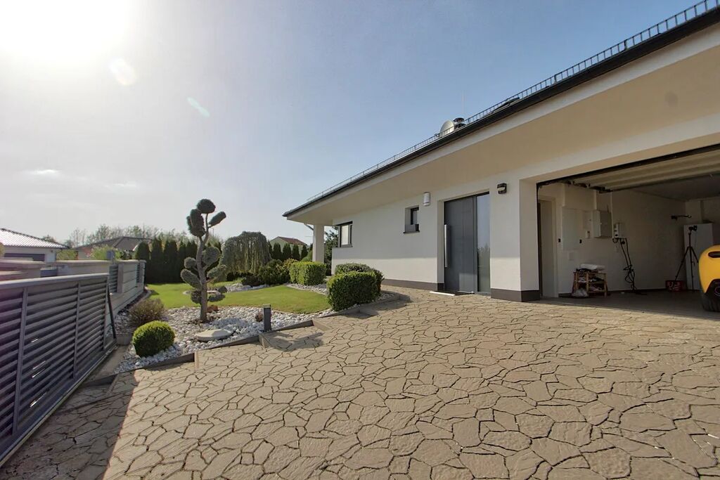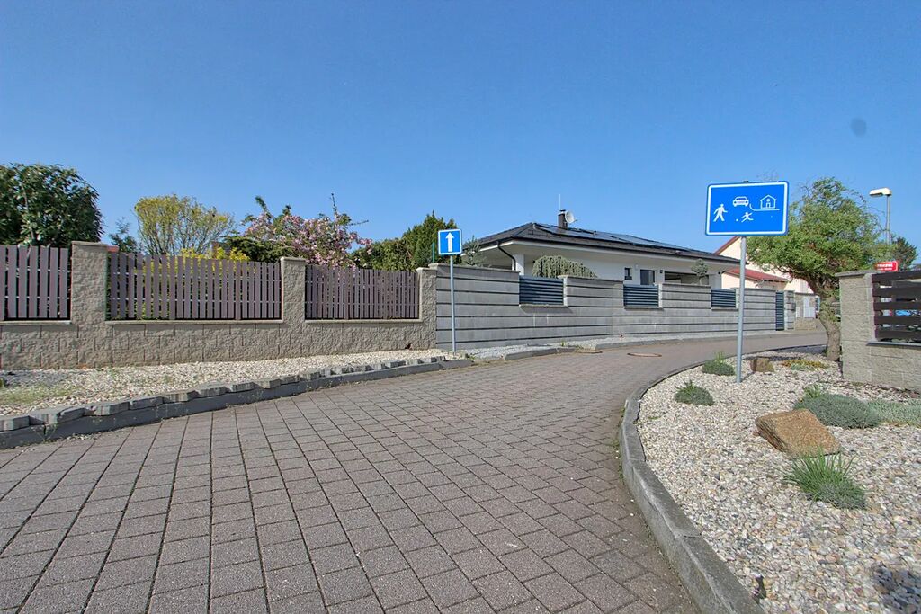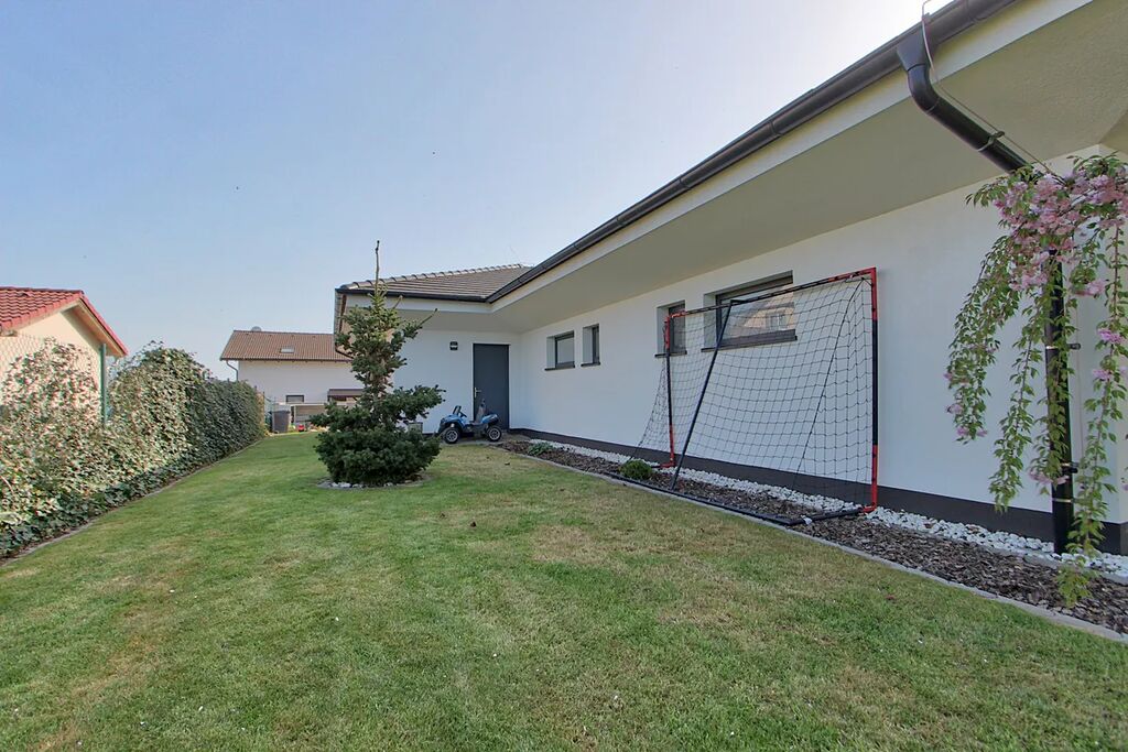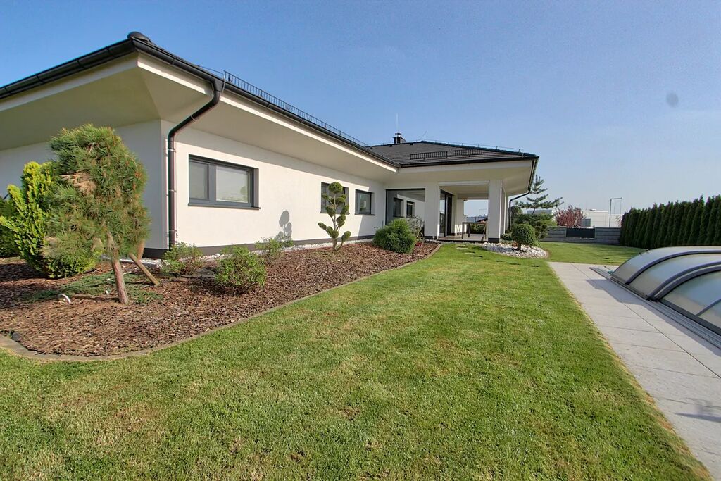 Dům má podobu bungalovu, o podlahové ploše 260 m2, je koncipován jako 4kk, kterému vévodí prostorný obývací pokoj s krbem a kuchyní, kde naleznete vše potřebné, včetně špíže. Dům je rozdělen na denní a noční část, což jistě ocení rodiče dětí. Naleznete zde tři ložnice, dvě jsou dětské, třetí je manželská. V té nechybí šatna, en-suit koupelna se sprchovým koutem a saunou pro relaxaci. Na chodbě naleznete záchod pro návštěvy, technickou místnost s pračkou a sušičkou, šatnou pro dětské pokoje. Muže jistě potěší púrostorná dvojgaráž s elektronabíječkou, ve které je dostatek místa na vaše hobby a sklad. Úložný prostor naleznete v zádveří i na půdě.
