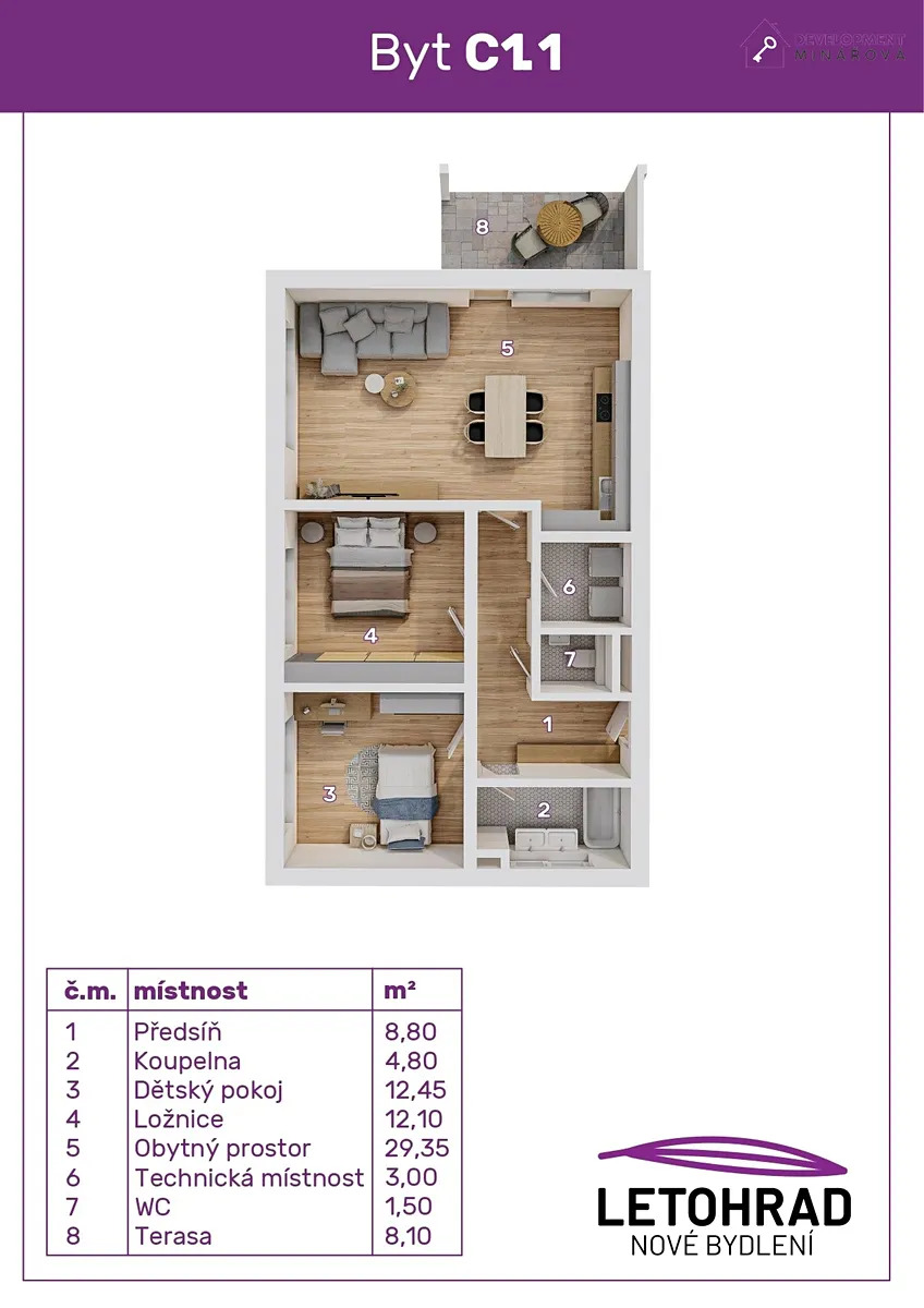 • Dispozice 3+kk – užitná plocha 72,2 m² - obývací pokoj spojen s kuchyní, 2 pokoje, koupelna, technická místnost/šatna a samostatné wc