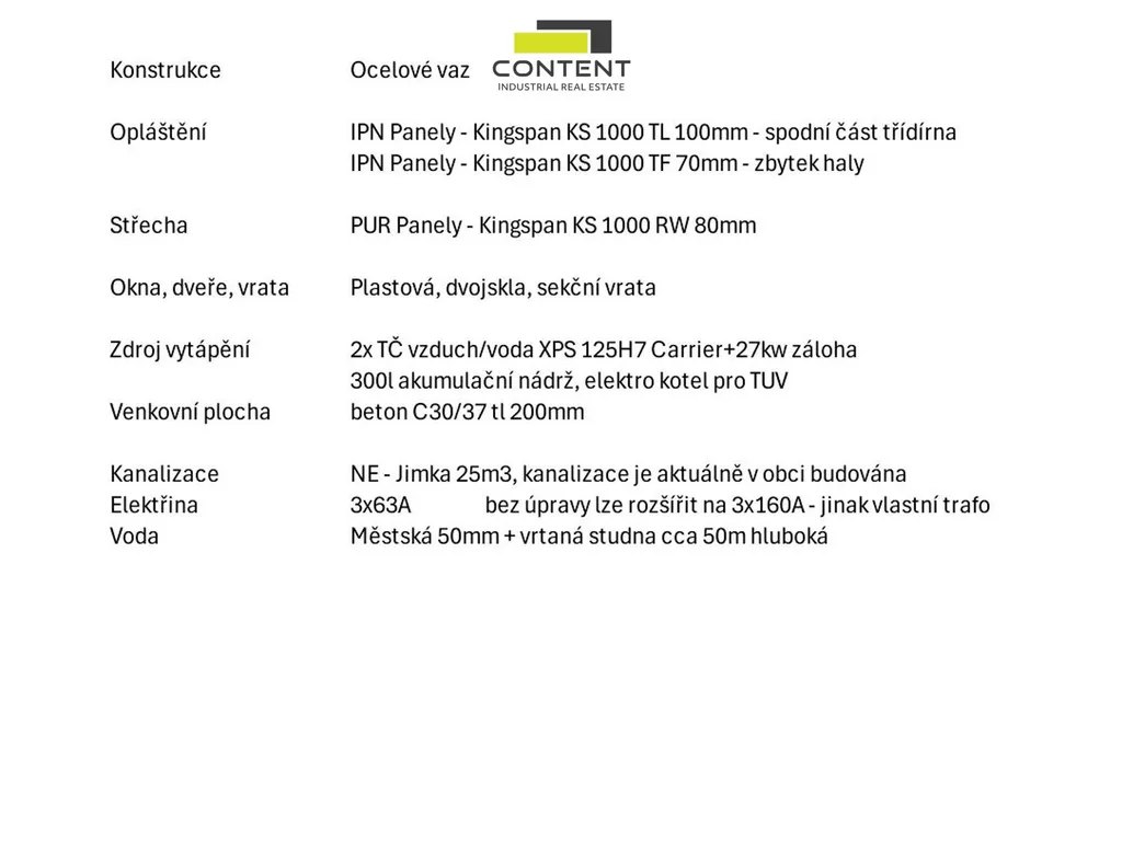 - vytápěná hala se zastavěnou plochou 1 200 m² (čistá výška 6,5 m), užitná plocha 1 584 m²,
