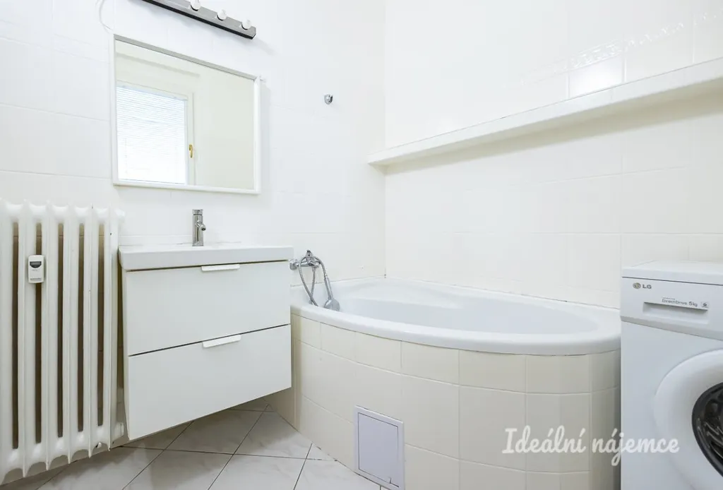 Koupelna je vybavena rohovou vanou, toaletou a umyvadlem, k dispozici je i pračka.