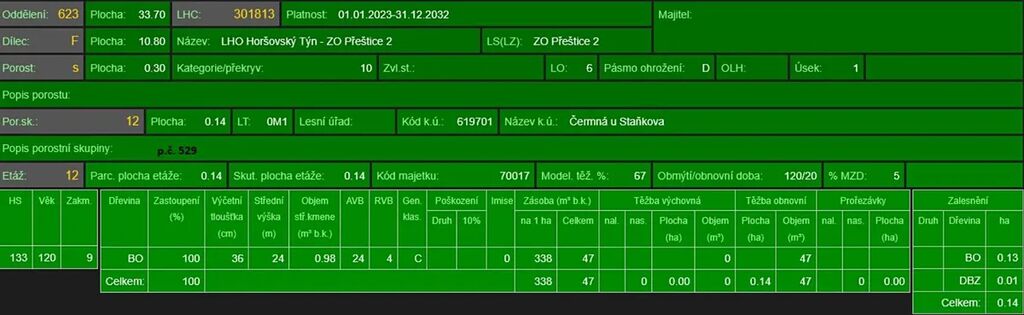 - p.č. 628 vedená jako lesní pozemek o celkové výměře 3 399 m2 (stáří lesa 142 let - zastoupení dřevin borovice )