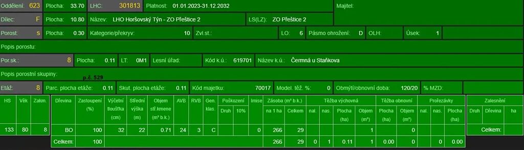 - p.č. 529 vedená jako lesní pozemek o celkové výměře 2 962 m2 (stáří lesa 122 let, 82 let a 51 let - zastoupení dřevin borovice )