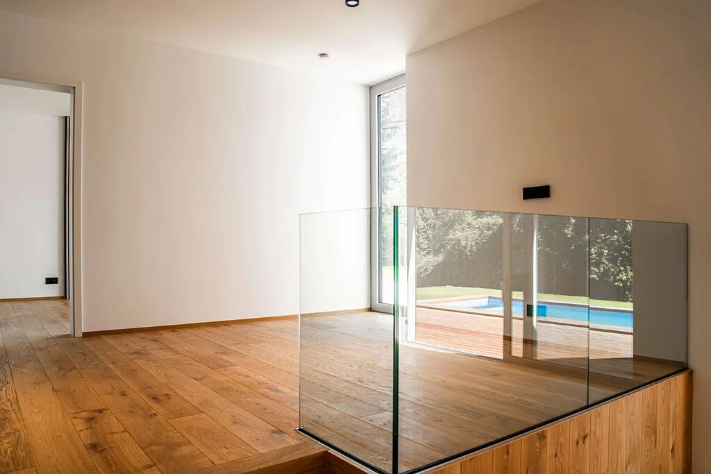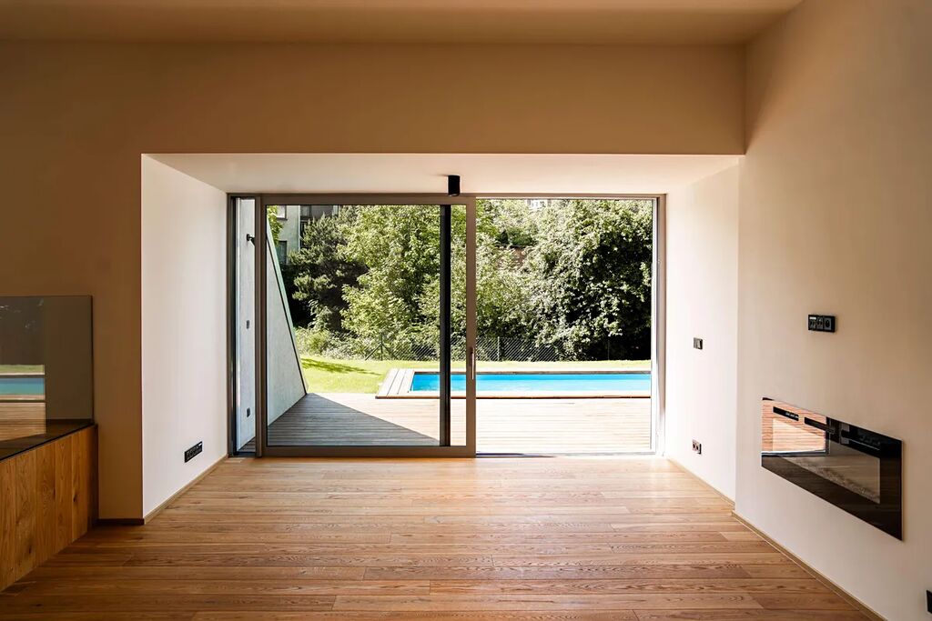 Hlavní ložnice má vlastní en-suite koupelnu a šatnu, další dvě ložnice jsou vybaveny vestavnými skříněmi. Dispozici doplňuje centrální koupelna s vanou, samostatná toaleta, prostorná šatna a technická místnost. Obytný prostor o výměře 50 m² je srdcem bytu a díky velkoformátovému prosklení plynule propojuje interiér s exteriérem.