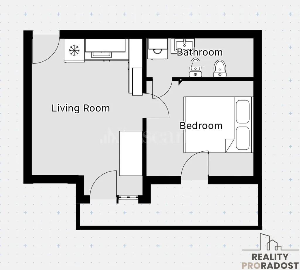 Nemovitost se skládá ze světlého obývacího pokoje s kuchyňským koutem a vstupem do malého venkovního prostoru. Na něj navazuje pohodlná ložnice s vlastní koupelnou vybavenou sprchovým koutem.