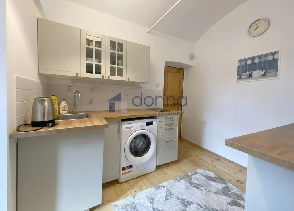 v první místnosti je nová kuchyňská linka s pračkou, lednicí a multifunkční troubou, dále jídelní stůl + 2 židle, oddělený sprchový kout s umyvadlem, ve druhé místnosti je patro na spaní s matrací, malá sedačka, stolek a TV, nová šatní skříň a police. Součástí je komora (sklep) na chodbě domu kde je možno uskladnit kolo, brusle atd.., samostatná toaleta.