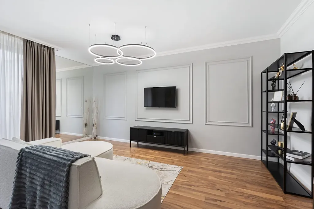 Byt spojuje nadčasovou eleganci s moderními prvky – mramorové detaily, designová svítidla, kvalitní nábytek a textilie.