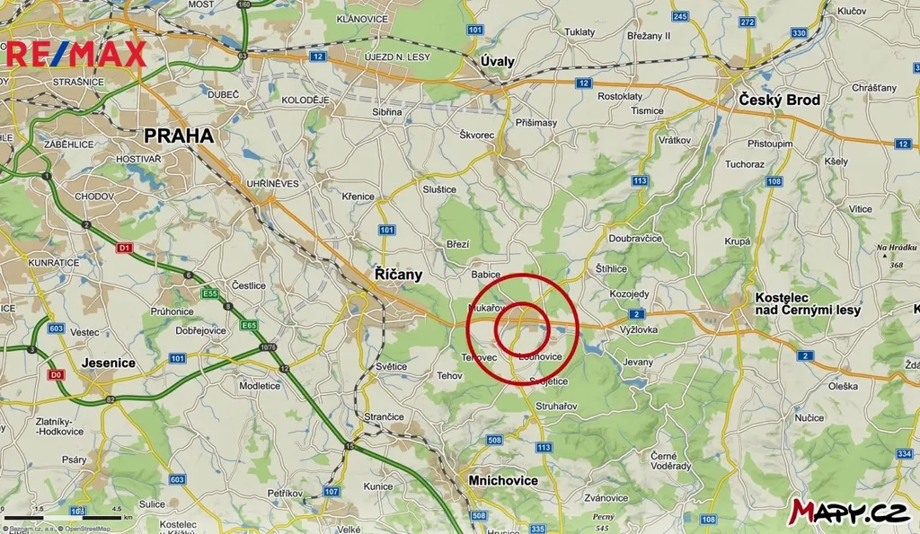 Dopravní dostupnost: Praha 21 km metro A i C, vlak Mnichovice i Říčany 8 km, Kostelec nad Černými lesy 8 km, vlak Úvaly 14 km.