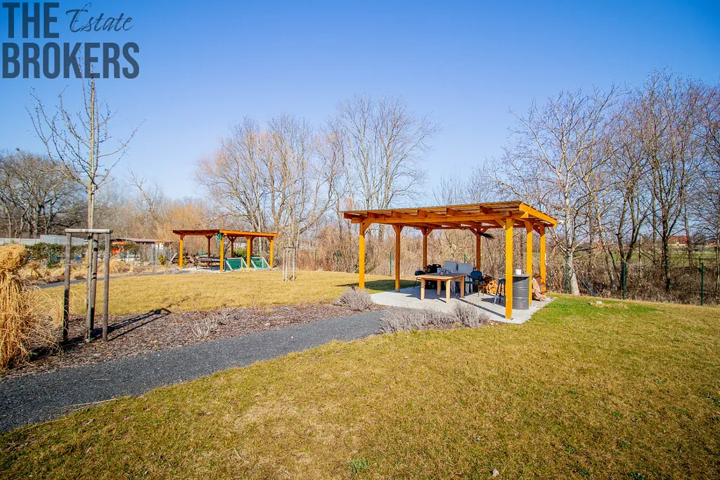 Areál je kompletně oplocený, vjezd zajišťuje pojezdová brána s pohodlným otevíráním na dálkové ovládání. Součástí areálu je společná zahrada s dvěma pergolami, ideální pro letní grilování a volnočasové aktivity. V areálu se také nachází dětské hřiště, což činí tento byt ideální volbou pro rodiny s dětmi.
