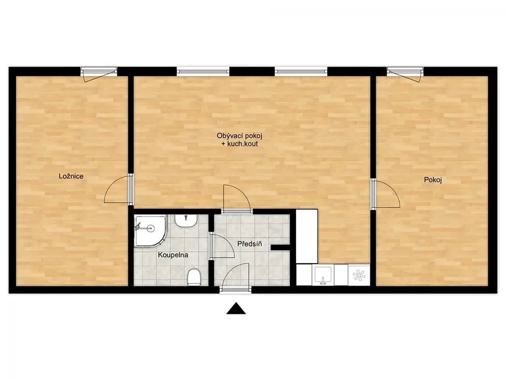 dlažbu v antracitové barvě a plovoucí podlahu v dekoru dřeva. K bytu patří i skladovací kóje - 3,6 m2, v