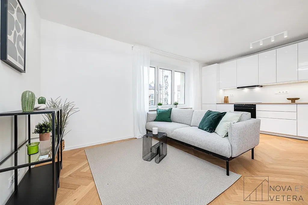 Interiér bytu právě prochází kompletní rekonstrukcí, která zahrnuje nové rozvody elektřiny, vody a odpadu, nové okna, dřevěné podlahy, obklady a dlažby italské značky Marazzi, stejně jako koupelnu a toaletu se sanitou Grohe. Součástí vybavení je kuchyňská linka na míru se spotřebiči prémiové značky Bosch.