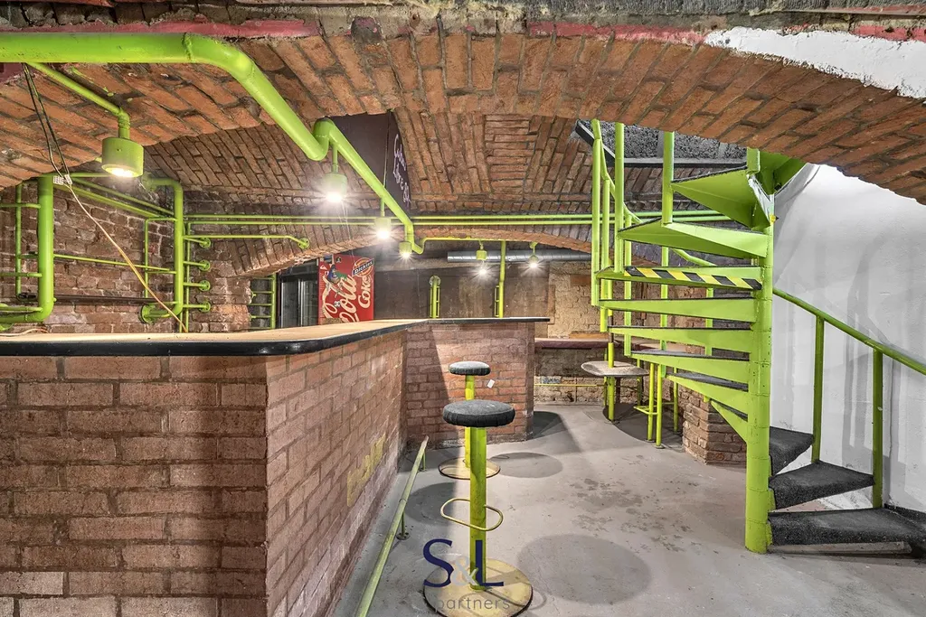 - Suterén (1. PP): hlavní sál s klenutými stropy, ideální pro klubový prostor, menší sál vhodný pro další zázemí nebo oddělenou místnost, sklady, technická místnost s kotelnou a další prostory pro provozní zázemí.