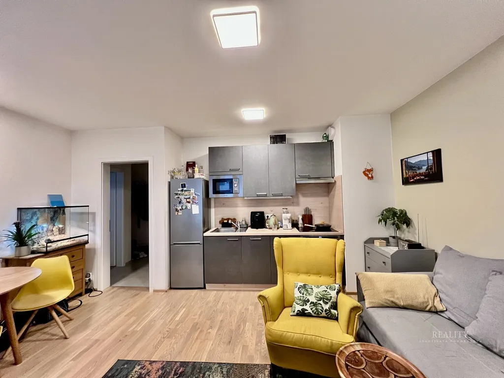 prostornější vstupní chodba, koupelna s vanou, WC a pračkou — působí čistě, moderně a prakticky, samostatná ložnice, obývací pokoj s kuchyňským koutem v elegantním tmavším provedení.