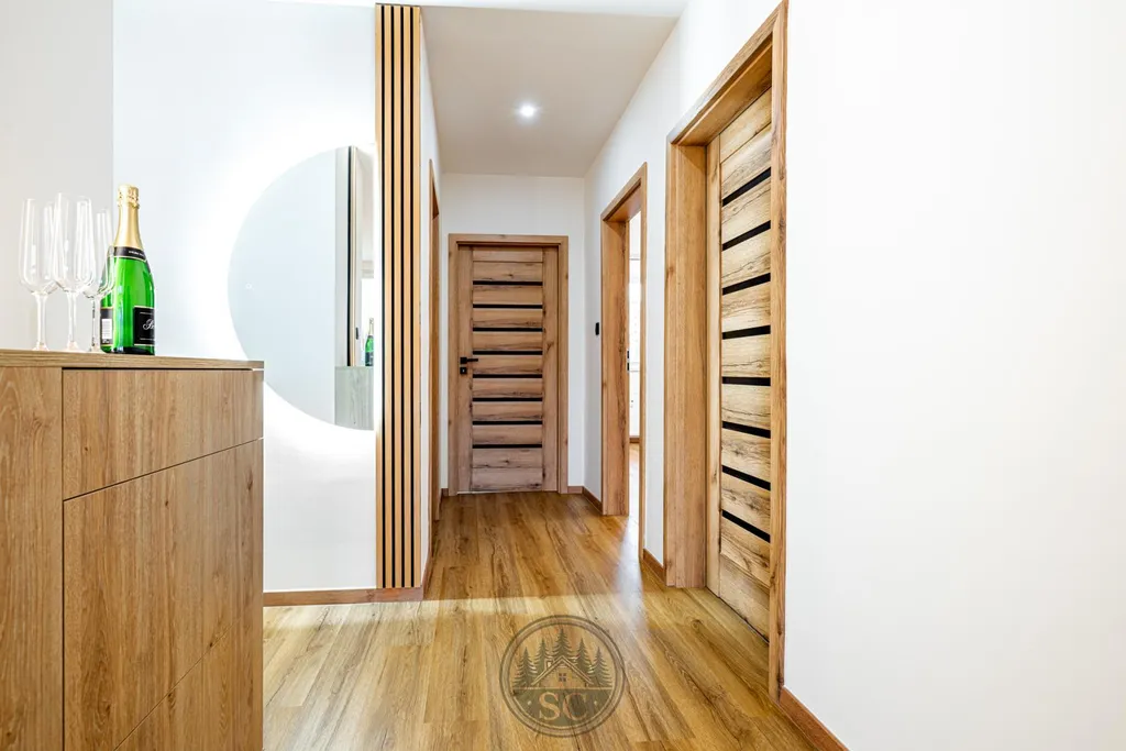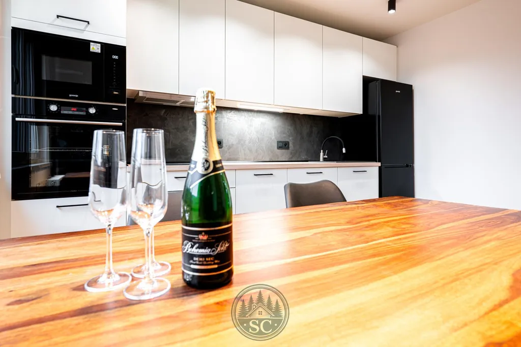 Hned po vstupu do bytu vaši pozornost upoutá nádherná kuchyně, která je skutečným srdcem celého domova. Dominantou prostoru je jídelní stůl z masivu se židlemi, kolem kterého je navržena elegantní kuchyňská linka na míru. Kuchyně je vybavena indukční varnou deskou, vestavnou troubou, mikrovlnnou troubou, myčkou a volně stojící lednicí, takže nabízí plnohodnotný komfort i moderní vzhled. Součástí kuchyně je také stylová komoda s integrovanou vinotékou, nad kterou je umístěn dřevěný dekor s podsvícenou lamelou. Tento prvek vytváří večer krásné ambientní osvětlení. Nad jídelním koutem jsou instalována designová světla navržená tak, aby neoslňovala, a před kuchyňskou linkou jsou samostatná stropní světla pro perfektní viditelnost při vaření.
