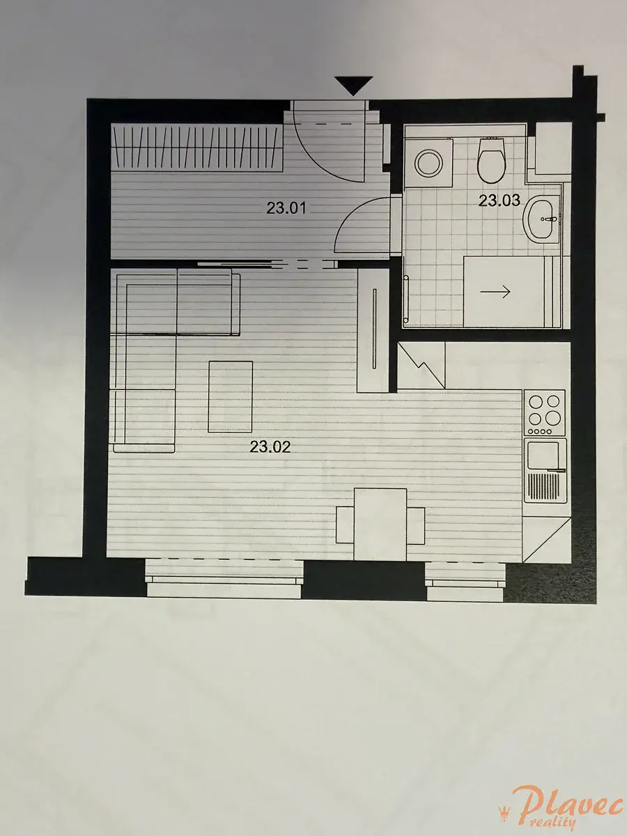 Dispozice: předsíň, pokoj s kuchyňským koutem, koupelna se sprchovým koutem a toaletou. K bytu náleží také sklep na patře a vlastní parkovací stání u domu.