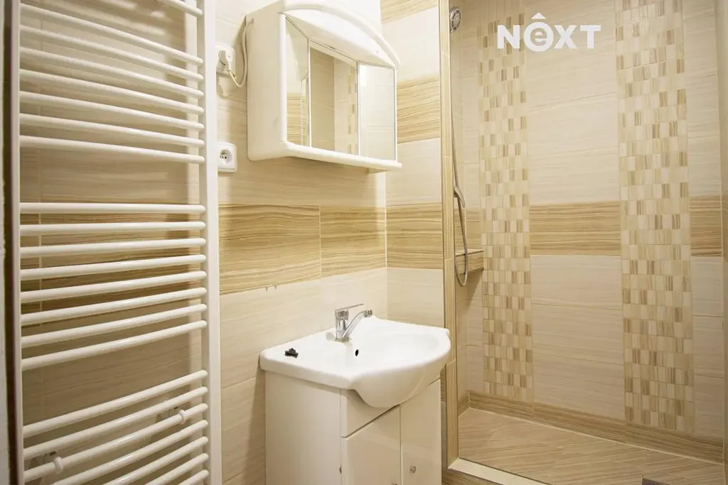 • Koupelna (2,9 m²) se sprchovým koutem, koupelnovým nábytkem a místem pro pračku.