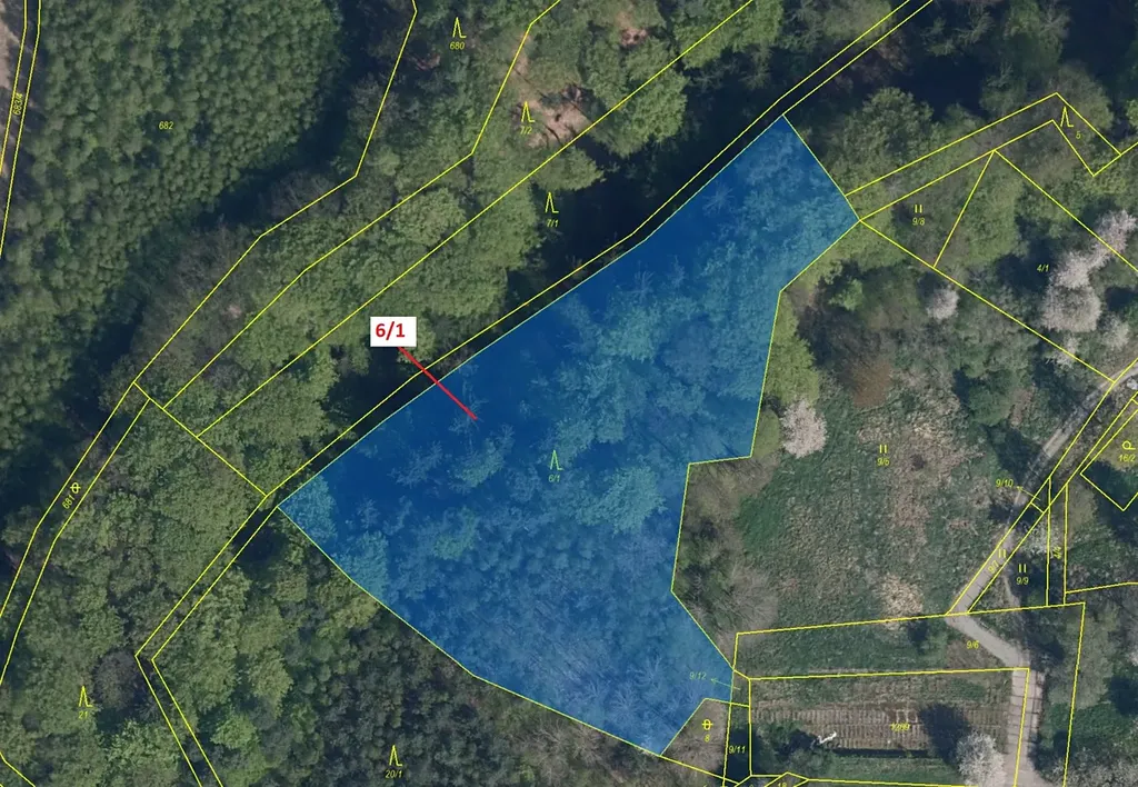 Lesní pozemek o výměře 6871 m2, parcelní číslo 6/1, podíl 1/1, katastrální území Dobřeň, obec Dobřeň, obec s rozšířenou působností Mělník, okres Mělník, Středočeský kraj. Po těžbě.