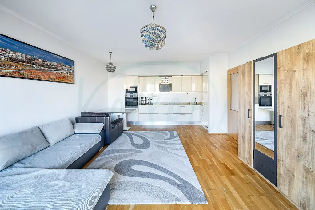 Srdcem bytu je světlý obývací pokoj s kuchyňským koutem, kde velkoformátová francouzská okna dodávají prostoru spoustu denního světla a plynule jej propojují s lodžií. Kuchyňská linka na míru s vestavěnými spotřebiči je prakticky řešená a přirozeně doplňuje obývací část. Ložnice má druhý vstup na lodžii. V předsíni se nachází vestavěný úložný kout se zrcadlem a místem na uložení oblečení. Z předsíně je také přístupná koupelna s vanou a samostatné WC. Dispozice je navržena tak, aby každý metr bytu měl praktické využití.
