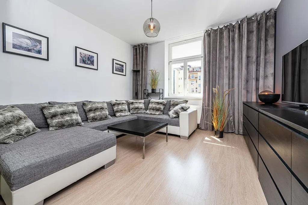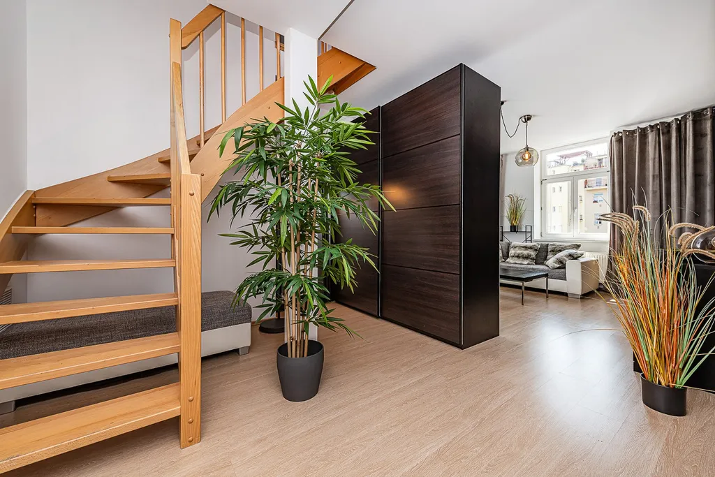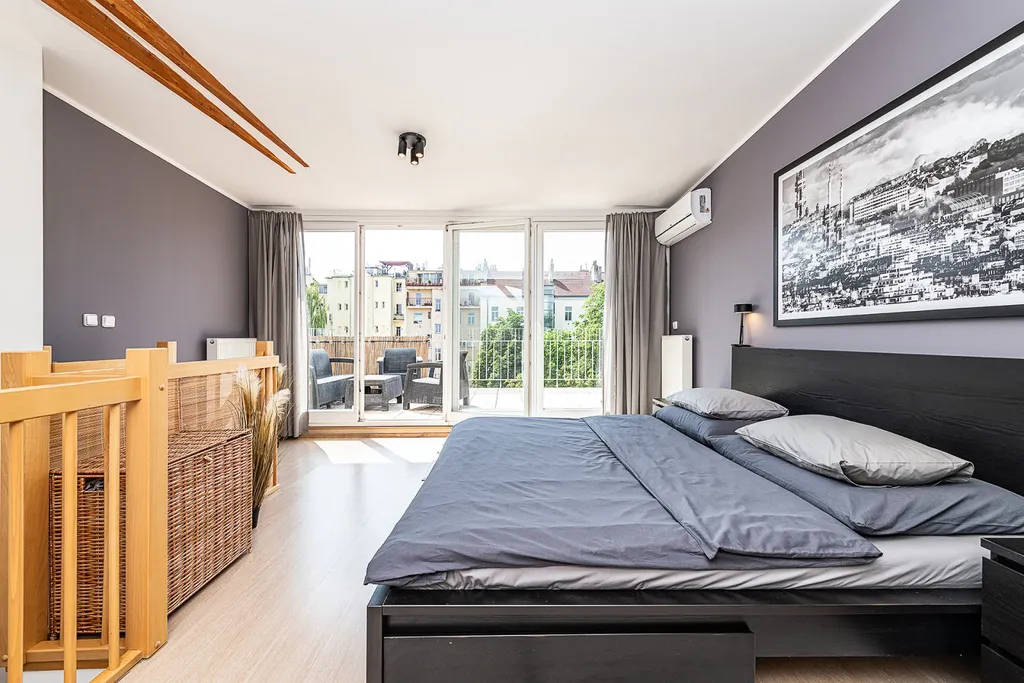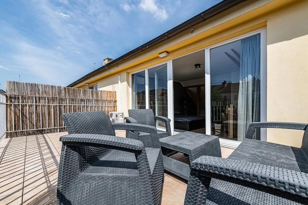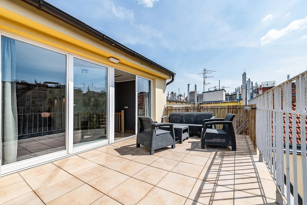 Nabízíme k pronájmu prostorný, slunný mezonetový byt 2+1 (100 m2) s jižně orientovanou terasou (16 m2) v 5. a 6. patře činžovního domu s výtahem ve vyhledávané lokalitě Praha 3 - Žižkov. Plně zařízený byt nabízí ve spodním patře vstupní halu, obývací pokoj s okny do tichého dvora, kompletně vybavenou kuchyň s jídelní částí, koupelnu s rohovou vanou a sprchou, toaletou, pračkou a sušičkou, a technickou/úložnou místnost. Hornímu patru dominuje ložnice (směrovaná do dvora) se vstupem na rozlehlou soukromou terasu s příjemným výhledem do vnitrobloku a na Žižkovskou věž. Je tady i malá koupelna se sprchovým koutem a toaletou. K vybavení bytu patří moderní nábytek, klimatizace a plynový kotel, internet, na podlahách jsou dřevěné parkety a dlažba. Dům se nachází na rozhraní Žižkova a Vinohrad, v oblíbené lokalitě s veškerou občanskou vybaveností, restauracemi, kavárnami, bistry, obchody, s výbornou dostupností do centra pěšky (cca 15 minut) nebo MHD, stanice tramvaje a metra je pouhých pár minut chůze. V blízkosti je park Riegrovy sady, náměstí Jiřího z Poděbrad, kde se pořádají farmářské trhy nebo náměstí Míru.