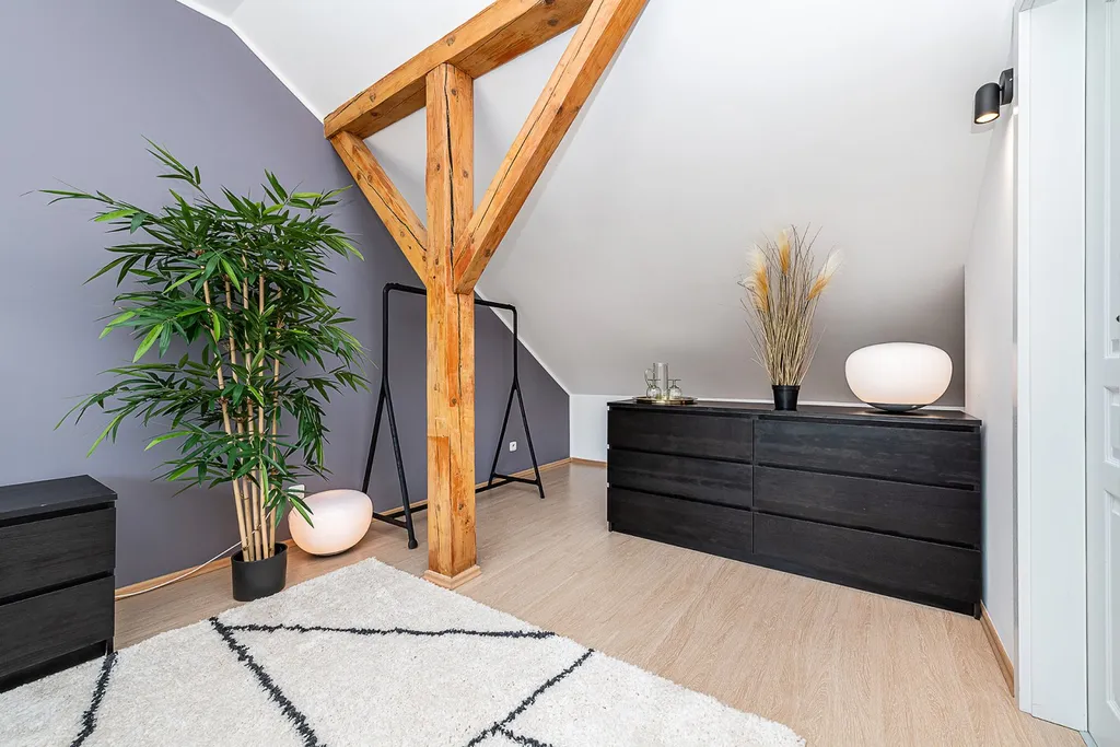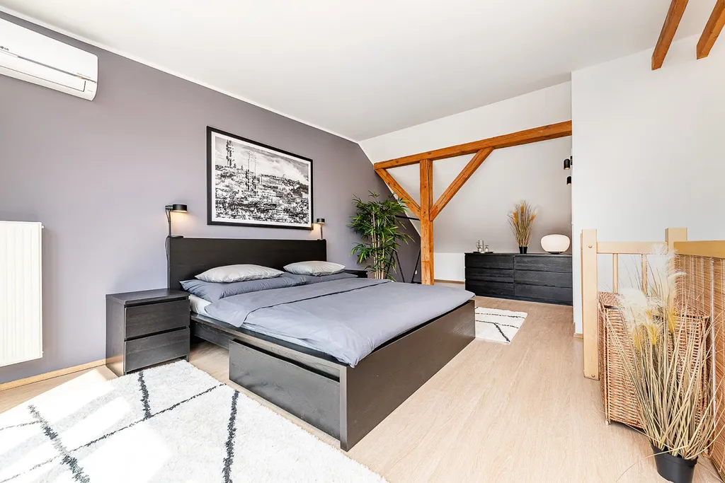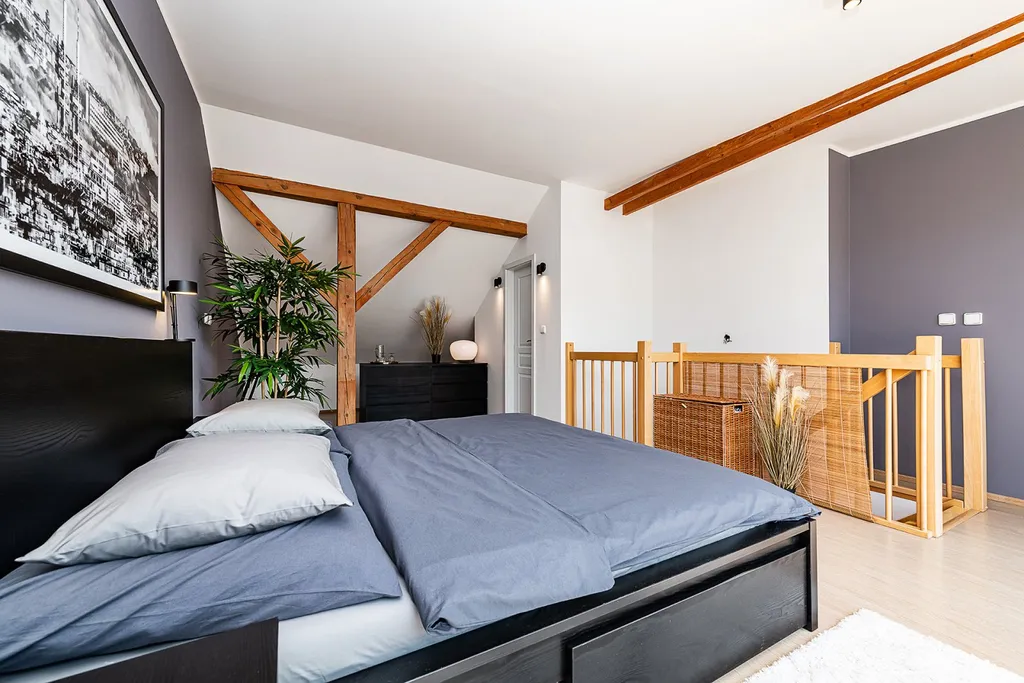(V případě dlouhodobého pronájmu možno dohodnout prohození dispozice bytu, tedy ložnice ve spodním patře, a obývací pokoj v horním patře.)