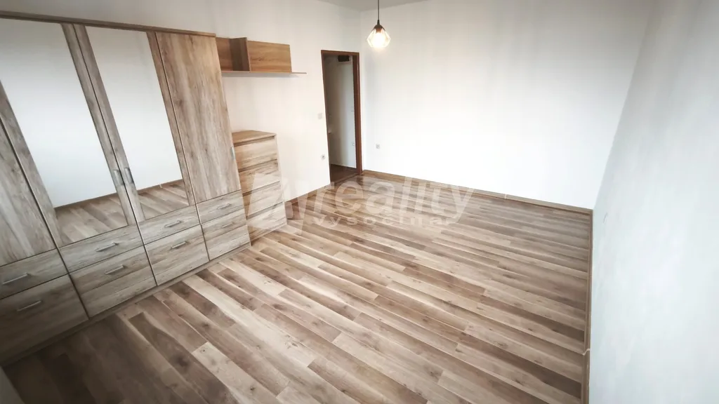 Dispoziční řešení bytu: z předsíně je nalevo vstup do ložnice, na samostatné WC, naproti vchodu do bytu se dostaneme do kuchyně s kuchyňskou linkou, odtud nalevo do koupelny s umyvadlem, vanou a napravo do obývacího pokoje. Všechna okna jsou orientována na slunnou jižní stranu-středový byt s výhledem do klidného vnitrobloku-možné využít i zadní vstup ze zadního parkoviště. Vytápění i ohřev vody je ústřední dálkové.