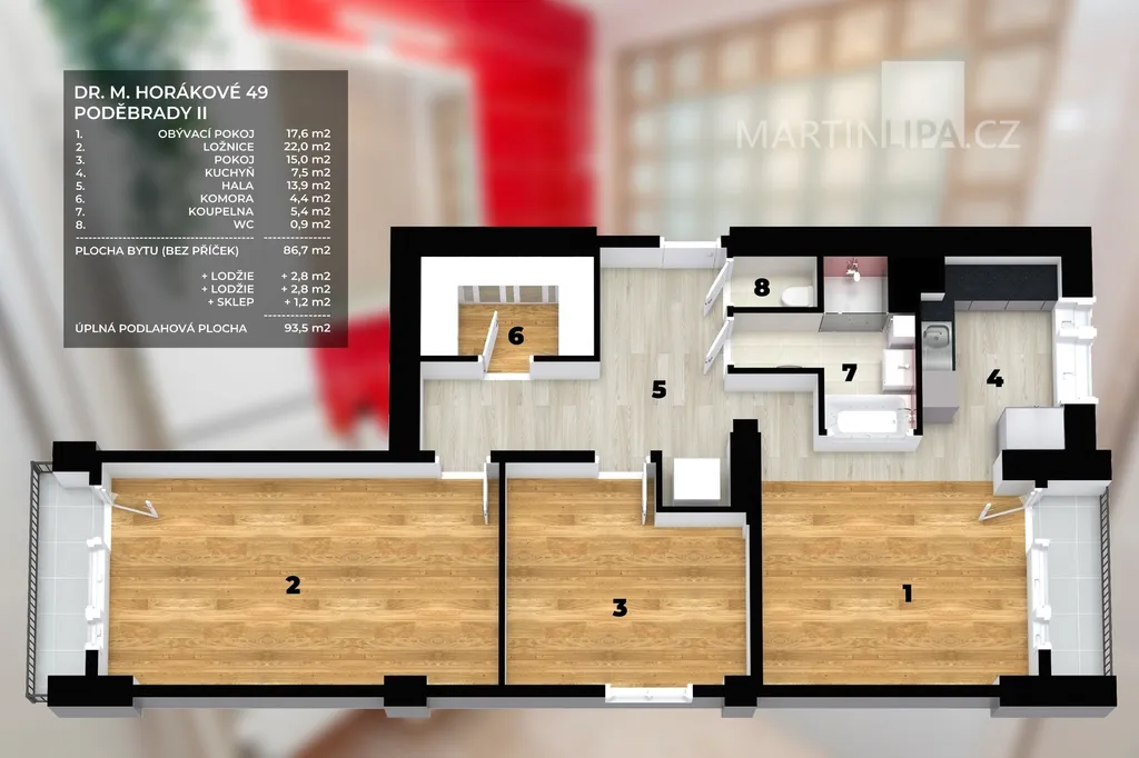 Jsme v Poděbradech, v bytě 3+1 o užitné ploše přes 86 metrů, s příslušenstvím dokonce 94. Po kompletní moderní rekonstrukci, v jedenáctém - předposledním - patře zatepleného panelového domu. V praxi to znamená: spousta světla, výhledy, ticho – a žádné starosti.