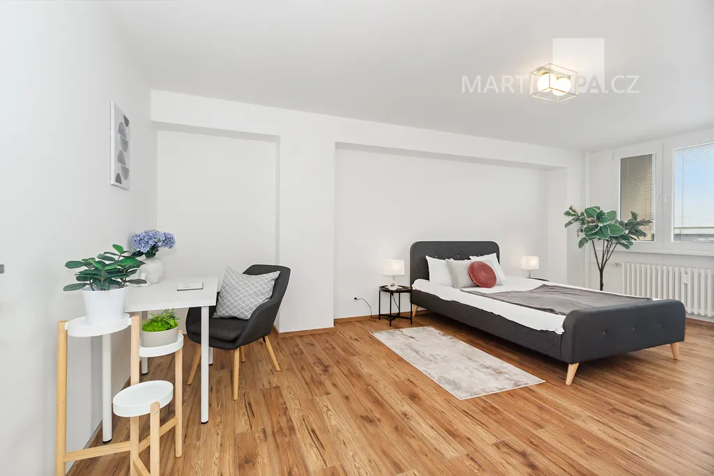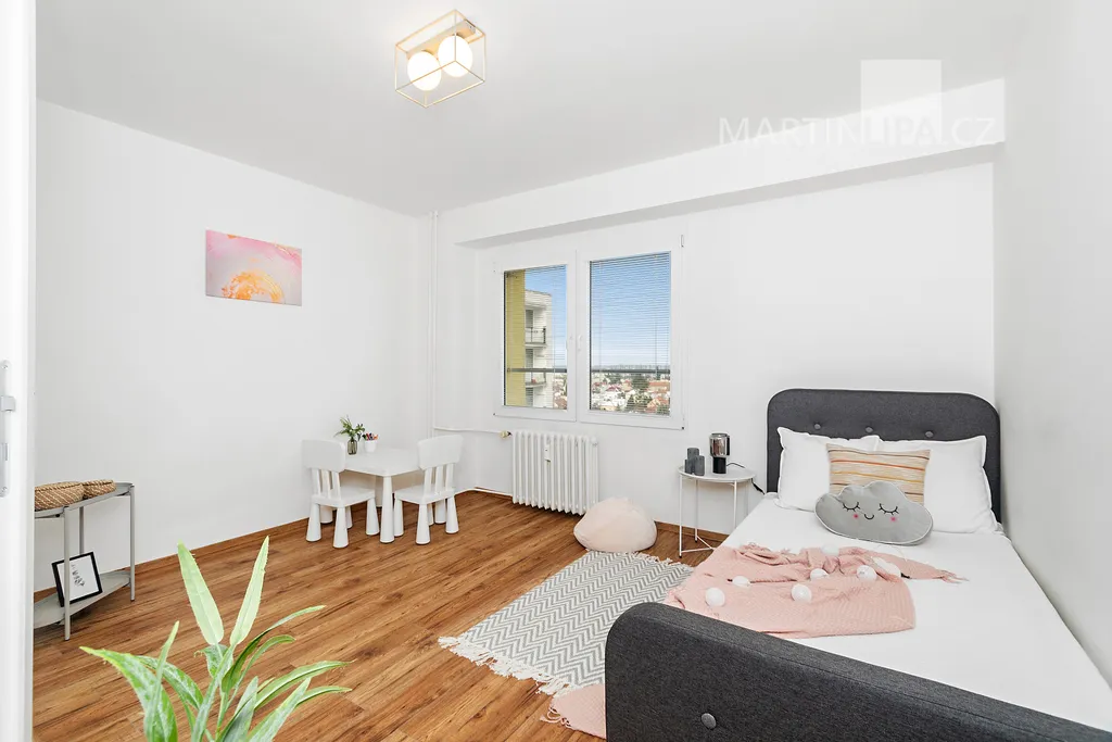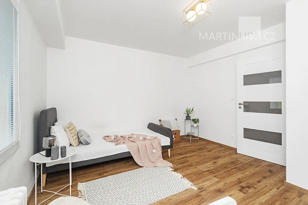 A teď do ložnice, kde rána začínají a večery končí. Na více než 22 metrech se sem vejde velká postel, skříň i pracovní stůl a pořád tu zůstane místo, aby místnost dýchala. Velká okna, vstup na lodžii. Místo, kde si člověk neukopne palec o postel a klidně si zacvičí jógu.